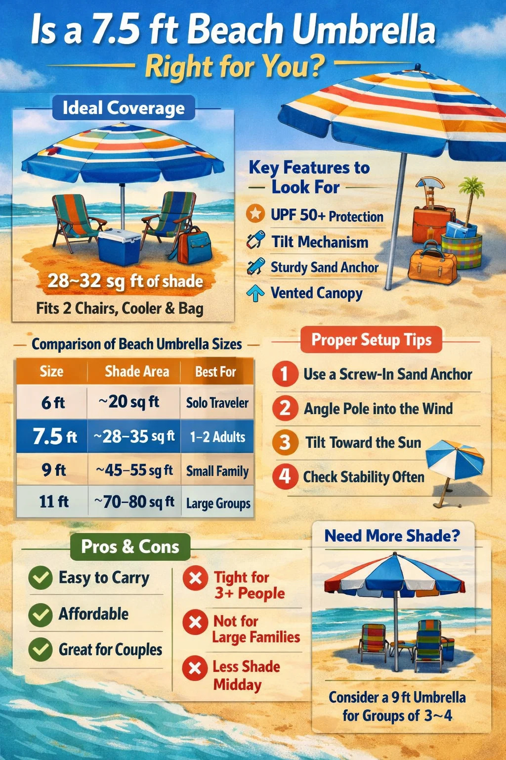 Lyhyt vastaus: 7,5 jalan aurinkovarjo on markkinoiden suosituin koko hyvästä syystä - Se kattaa noin 28-32 neliöjalkaa varjoisan alueen, joka riittää kahdelle rantatuolille, kylmälaukulle ja laukulle ilman, että kukaan istuu suorassa auringonvalossa. Jos teet ostoksia yksin tai parin kanssa, 7,5 jalan katos osuu kannettavuuden ja käytännöllisen kattavuuden väliin. Kolmen tai useamman hengen ryhmille kannattaa harkita 9 jalan vaihtoehtoja, mutta useimmille rantamatkoille 7,5 jalkaa on paras vaihtoehto.