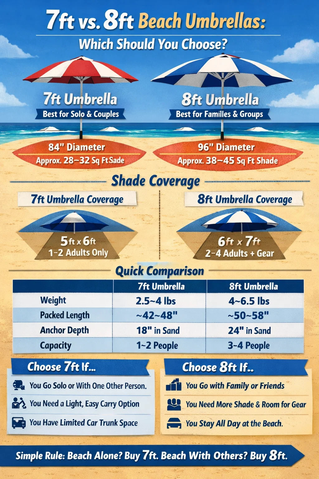 Jos et ole vielä päättänyt, käytä tätä yksinkertaista sääntöä: jos olet rannalla yksin, osta 7ft; jos rantaat muiden kanssa, osta 8ft. Oikein ankkuroituna ja UPF 50 -katoksena molemmat koot antavat sinulle turvallisemman ja mukavamman päivän rannalla kuin ilman sateenvarjoa.
