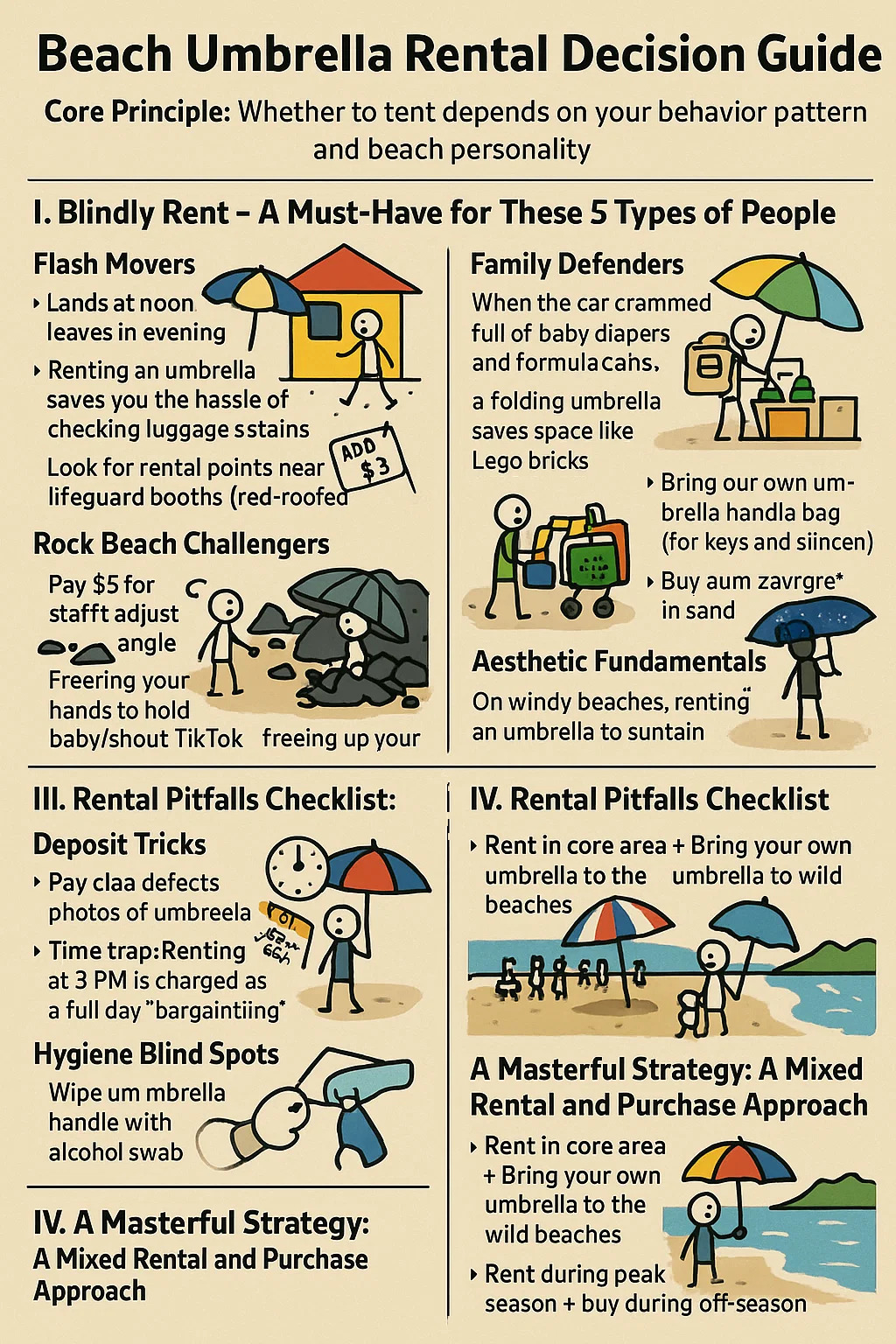 Flash Movers: Laskeutuu keskipäivällä, lähtee illalla → Sateenvarjon vuokraaminen säästää matkatavaroiden tarkastamisen vaivaa. Etsi vuokrapisteitä hengenpelastuskoppien läheltä (punakattoiset, keltaseinäiset mökit). Laita talletuslappu puhelimen koteloon, jotta et menetä sitä.
