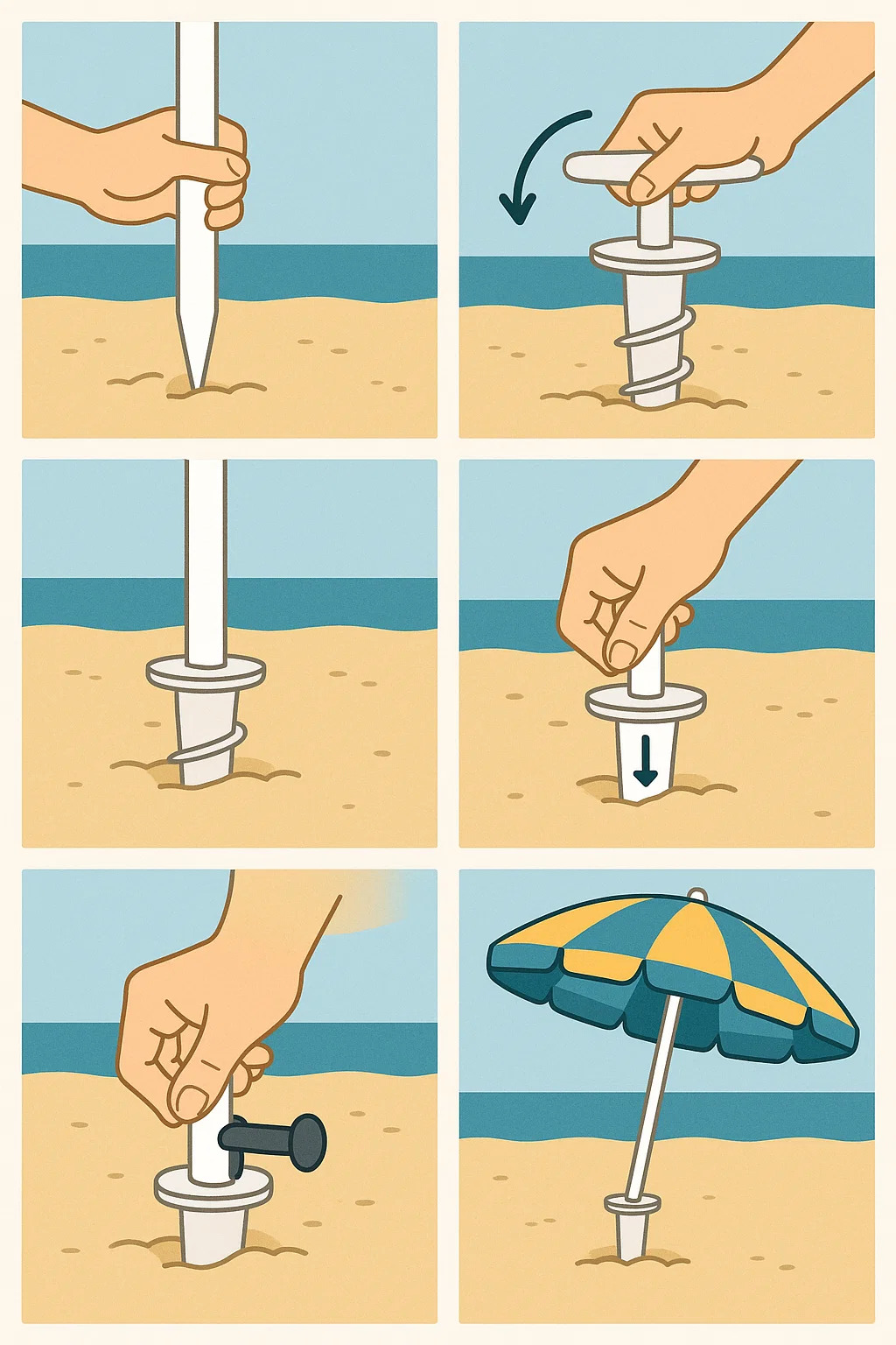 Syvyys: Jatka pyörimistä, kunnes suurin osa sateenvarjon hiekkaankkurista tai ruuvipohjasta (yleensä yli kaksi kolmasosaa, mieluiten koko ruuviosa) on hautautunut hiekkaan, jolloin vain ylempi aukko aurinkovarjon pylvään työntämistä varten jää näkyviin hiekan yläpuolelle. Mitä syvemmälle se on haudattu, sitä parempi ankkurointivaikutus.