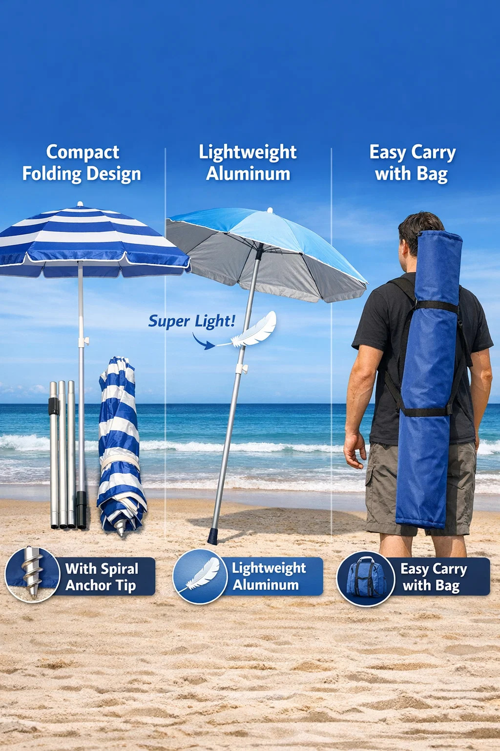 Tilan säästämiseksi on parasta ostaa aurinkovarjo, jossa on "kierreporan" pää tangon alareunassa, jolloin sinun ei tarvitse kantaa ylimääräistä tilaa vievää muovipohjaa tai erillistä hiekkaankkuria.