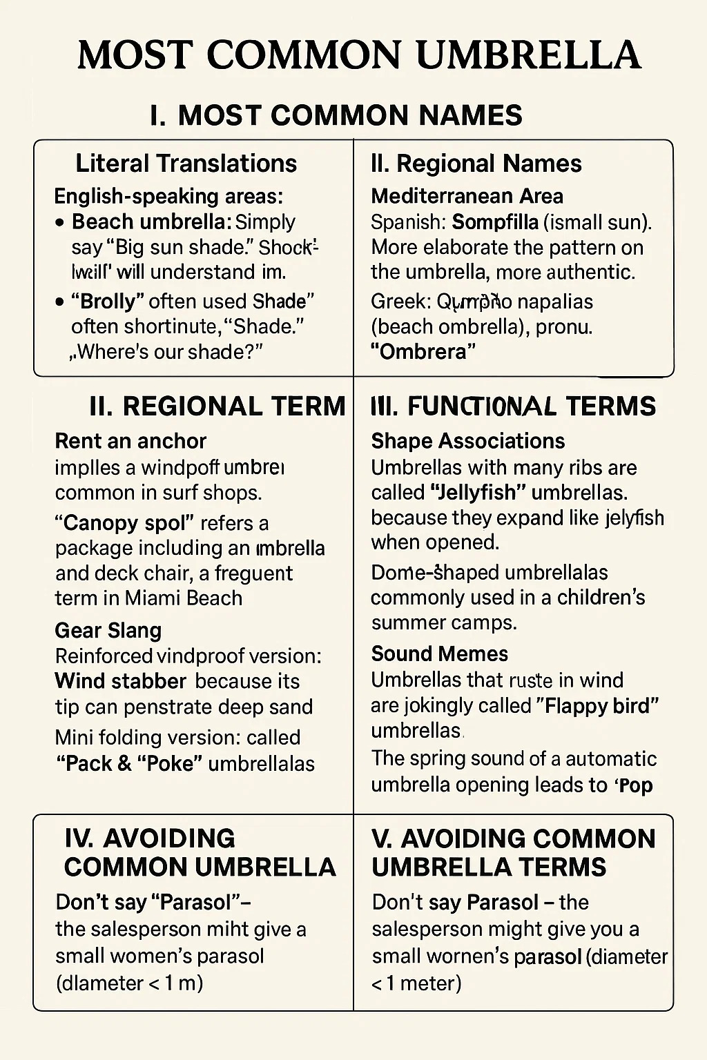 Tässä on yleisiä nimiä aurinkovarjot eri yhteyksissä: