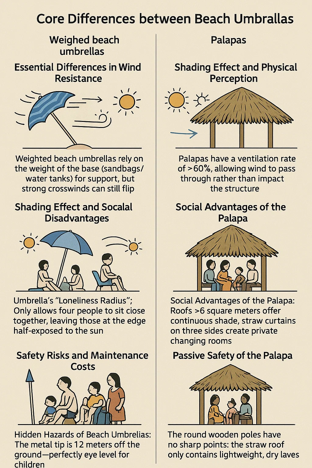 Ranta sateenvarjo -auringonsuojauksen rajoitukset: Sateenvarjon alla oleva varjo muuttuu auringon kulmassa, mikä vaatii usein säätöjä. Hopeapäällyste heijastaa lämpösäteilyä maasta tehottomasti, joten jopa keskipäivällä, kun hiekan pinta on 60 ° C, sateenvarjon alla oleva lämpötila voi silti ylittää 40 ° C. Palapas tarjoaa luonnollisen jäähdytyksen: paksuuntuneet kämmenryhmät imevät lämpöä sen sijaan, että heijastavat sitä, pitäen vakio kosteustasoa (mitattuna rannalla, 3-5 ° C alempi kuin sateenvarjon alla); Täysi auringonvarjo ei vaadi säätöä.